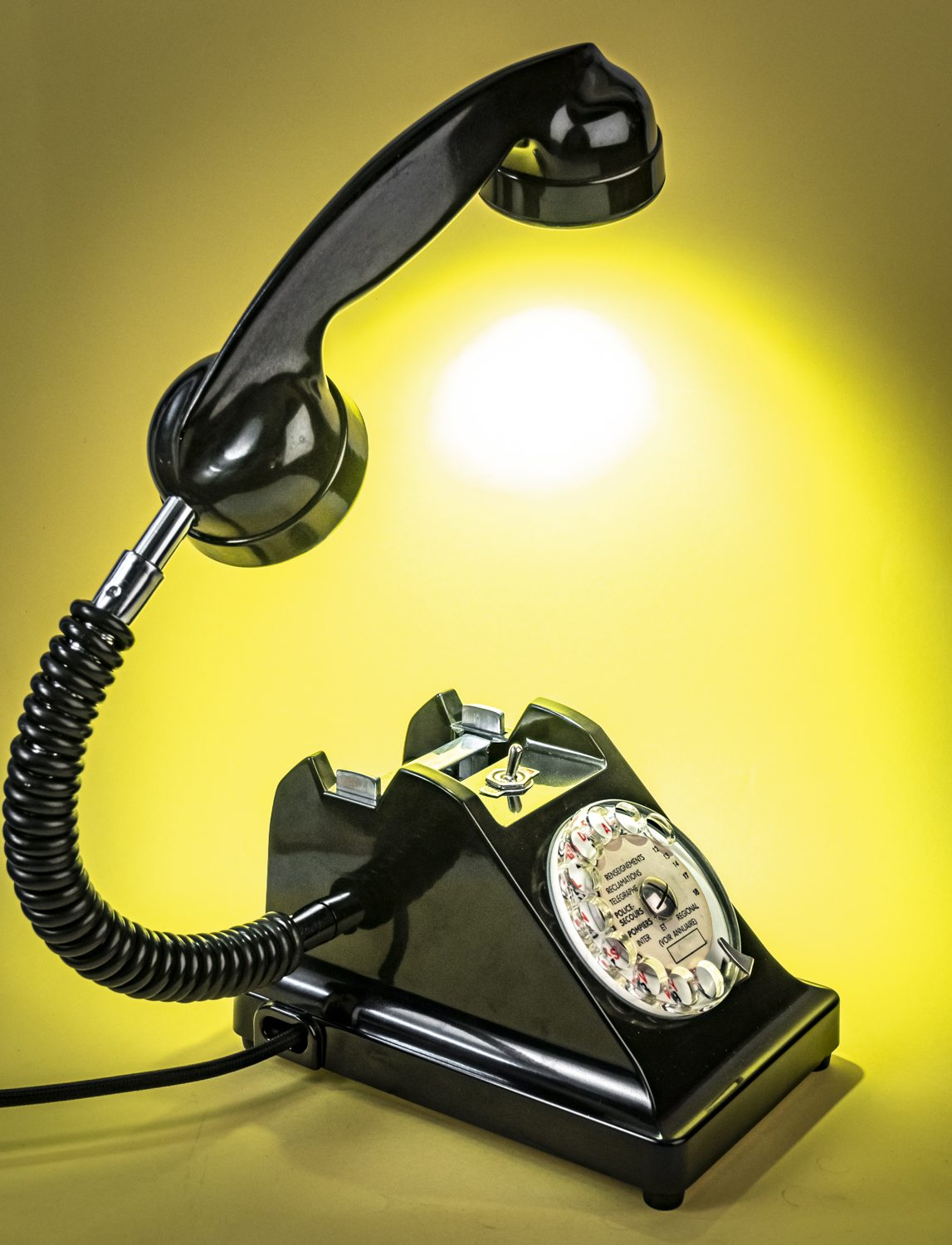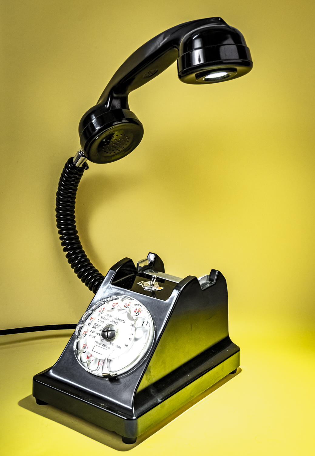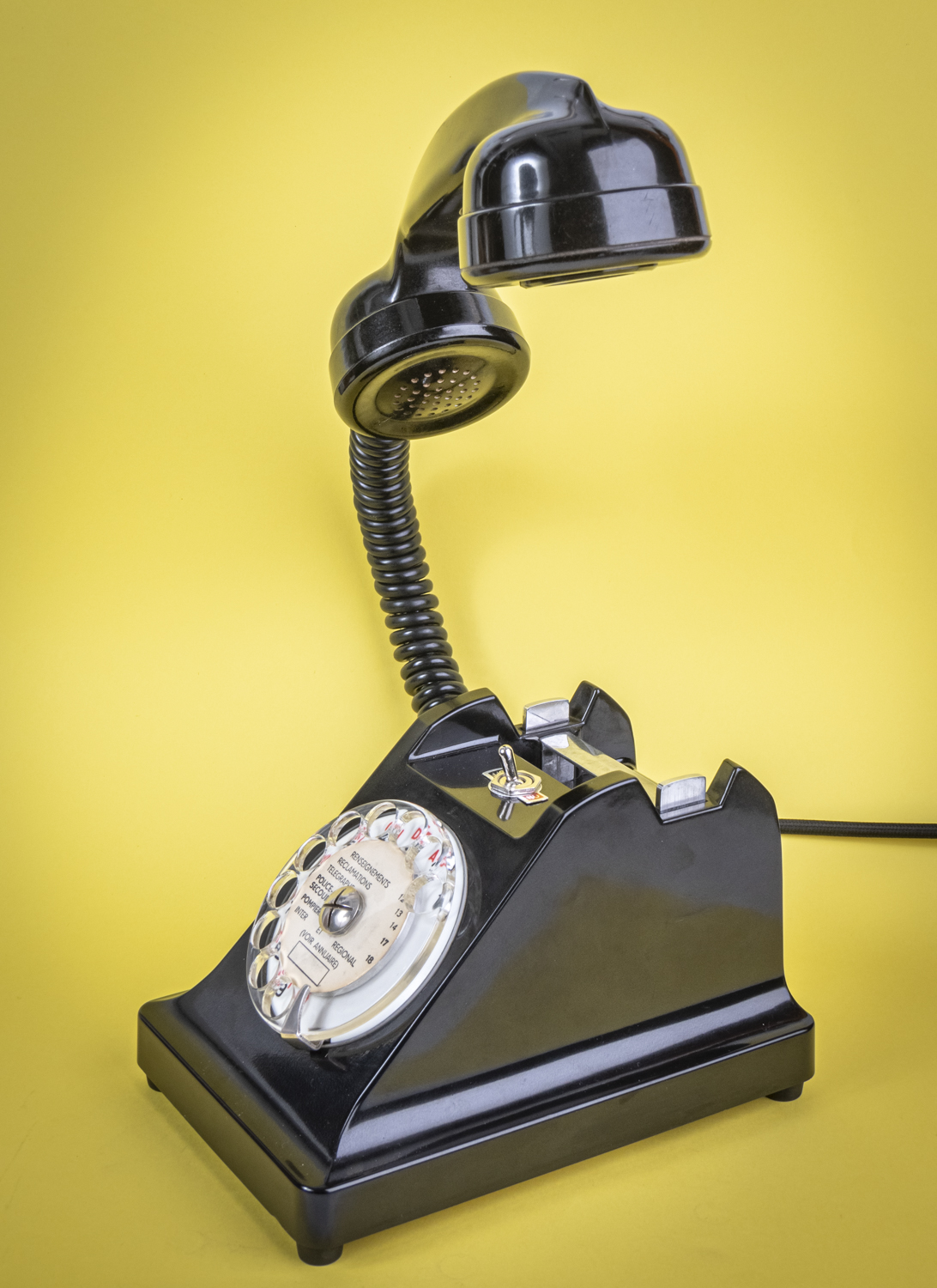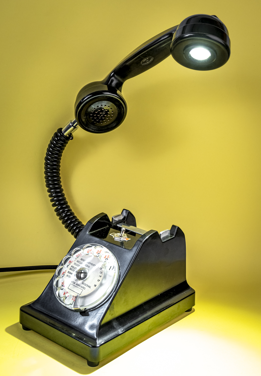 Après un petit tour du côté des années 70/80, avec Allo#02 qui s’est fait la malle en décembre, je reviens dans les années 50/60 avec un nouvel exemplaire de ce magnifique téléphone Ericsson tout en bakélite noire, et qui répond au doux nom de U43. C’est comme si U2 avait 41 U de plus. Comprenne qui peut. Déniché dans un état exceptionnel, le voici donc, comme ses prédécesseurs, équipé d’une mini loupiote, néanmoins assez puissante, logée dans l’écouteur du combiné. De quoi en faire une spectaculaire lampe de bureau orientable à l’envi grâce à un flexible inséré dans le câble spiralé d’origine. C’est un peu comme si l’homme invisible habitait chez vous et passait sa vie au bout du fil. Opérée, comme toujours par le très vintage interrupteur à levier assorti, rouge et noir. Un très beau câble rond tissé muni d’une élégante fiche à l’ancienne complète cet ensemble singulier. Attention, info de première utilité : vu qu’il n’y en a qu’un seul exemplaire, il n’y en aura pas pour tout le monde. Bref, si vous voulez acquérir ce téléphone, appelez-moi…