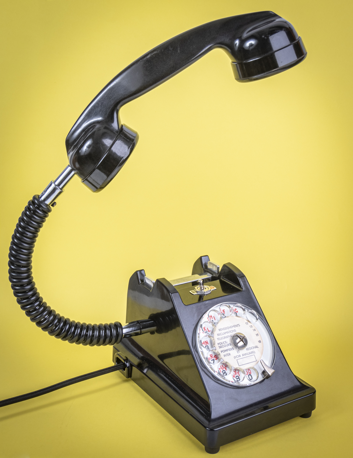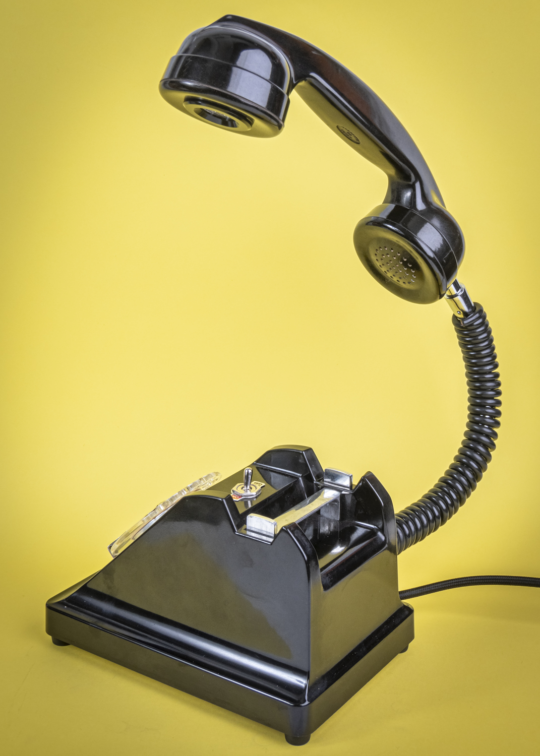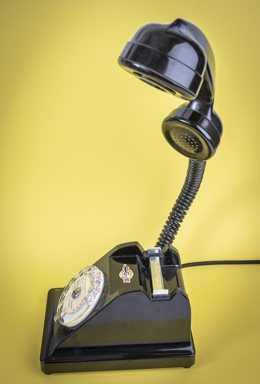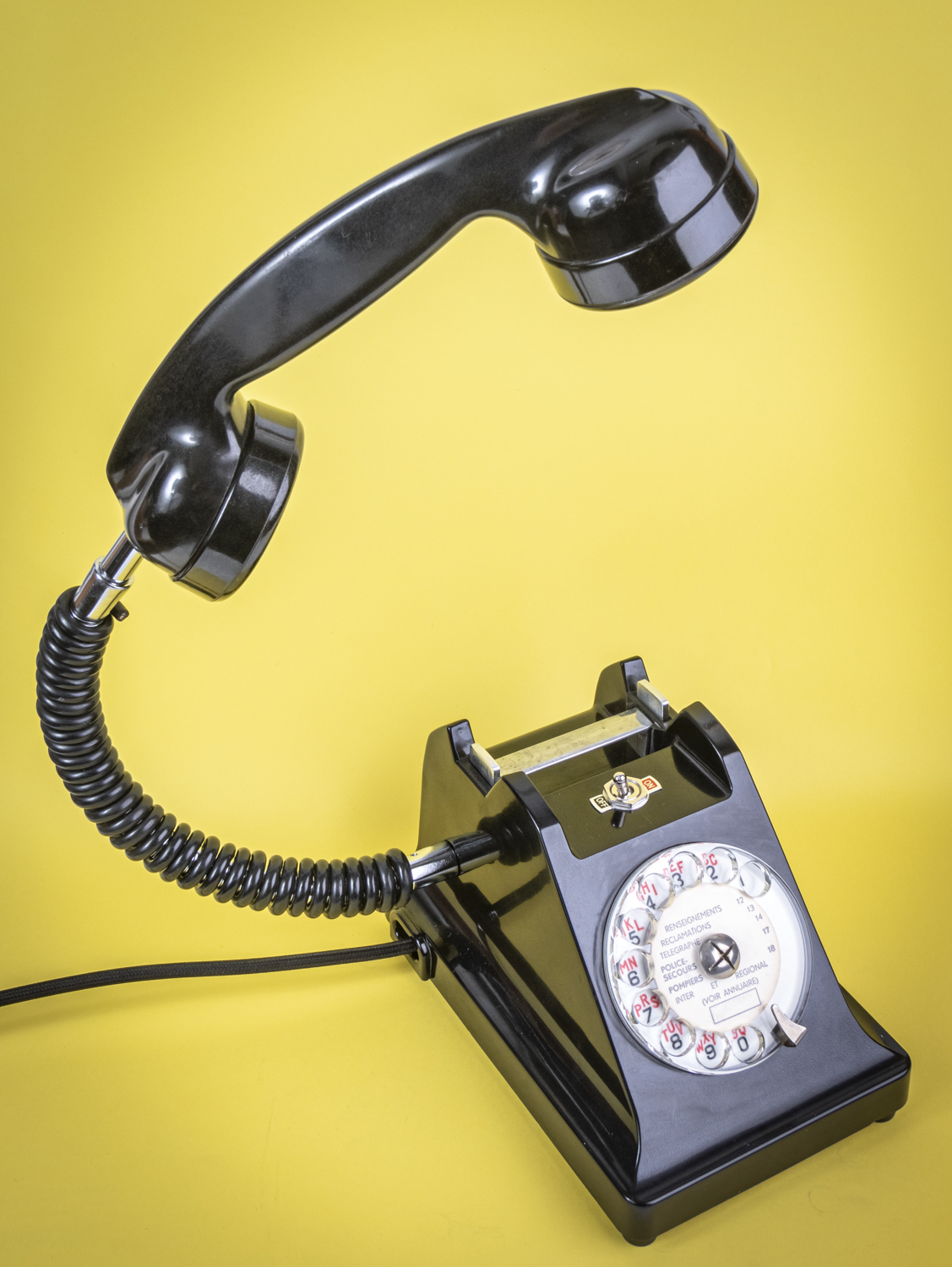 Après un petit tour du côté des années 70/80, avec Allo#02 qui s’est fait la malle en décembre, je reviens dans les années 50/60 avec un nouvel exemplaire de ce magnifique téléphone Ericsson tout en bakélite noire, et qui répond au doux nom de U43. C’est comme si U2 avait 41 U de plus. Comprenne qui peut. Déniché dans un état exceptionnel, le voici donc, comme ses prédécesseurs, équipé d’une mini loupiote, néanmoins assez puissante, logée dans l’écouteur du combiné. De quoi en faire une spectaculaire lampe de bureau orientable à l’envi grâce à un flexible inséré dans le câble spiralé d’origine. C’est un peu comme si l’homme invisible habitait chez vous et passait sa vie au bout du fil. Opérée, comme toujours par le très vintage interrupteur à levier assorti, rouge et noir. Un très beau câble rond tissé muni d’une élégante fiche à l’ancienne complète cet ensemble singulier. Attention, info de première utilité : vu qu’il n’y en a qu’un seul exemplaire, il n’y en aura pas pour tout le monde. Bref, si vous voulez acquérir ce téléphone, appelez-moi…