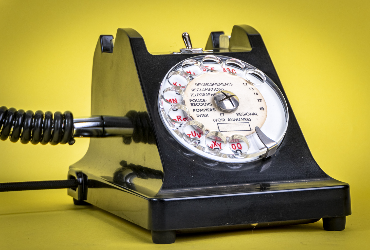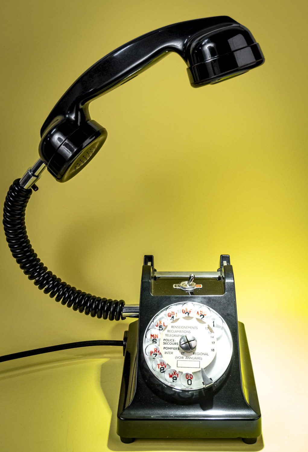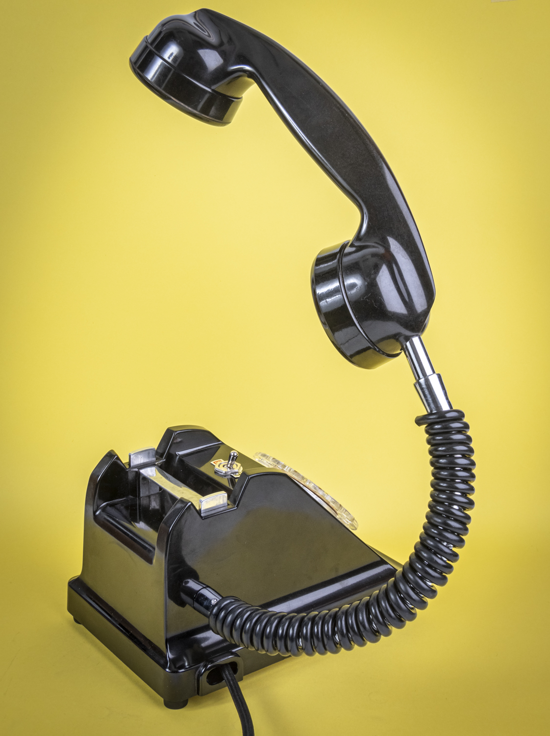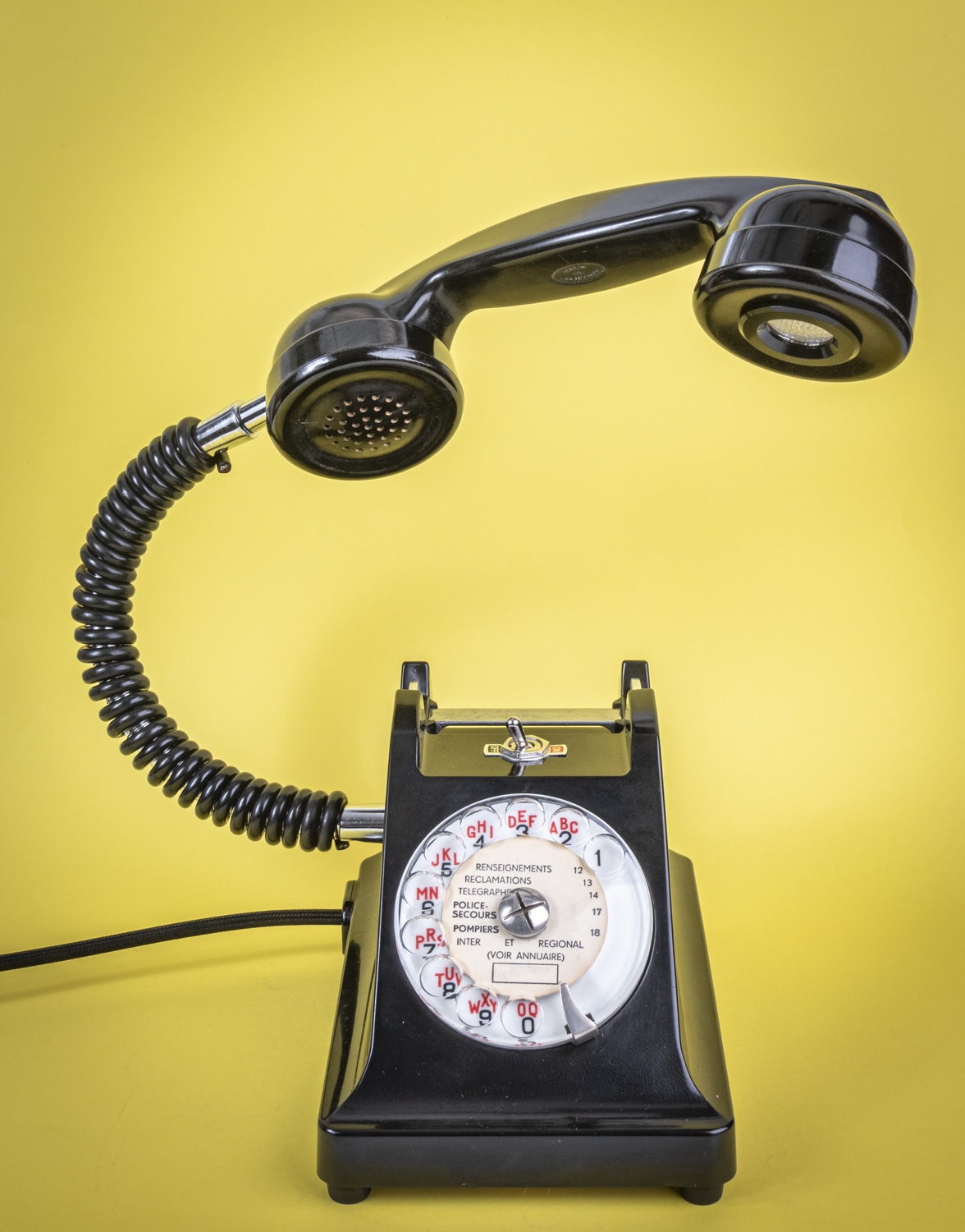 Après un petit tour du côté des années 70/80, avec Allo#02 qui s’est fait la malle en décembre, je reviens dans les années 50/60 avec un nouvel exemplaire de ce magnifique téléphone Ericsson tout en bakélite noire, et qui répond au doux nom de U43. C’est comme si U2 avait 41 U de plus. Comprenne qui peut. Déniché dans un état exceptionnel, le voici donc, comme ses prédécesseurs, équipé d’une mini loupiote, néanmoins assez puissante, logée dans l’écouteur du combiné. De quoi en faire une spectaculaire lampe de bureau orientable à l’envi grâce à un flexible inséré dans le câble spiralé d’origine. C’est un peu comme si l’homme invisible habitait chez vous et passait sa vie au bout du fil. Opérée, comme toujours par le très vintage interrupteur à levier assorti, rouge et noir. Un très beau câble rond tissé muni d’une élégante fiche à l’ancienne complète cet ensemble singulier. Attention, info de première utilité : vu qu’il n’y en a qu’un seul exemplaire, il n’y en aura pas pour tout le monde. Bref, si vous voulez acquérir ce téléphone, appelez-moi…