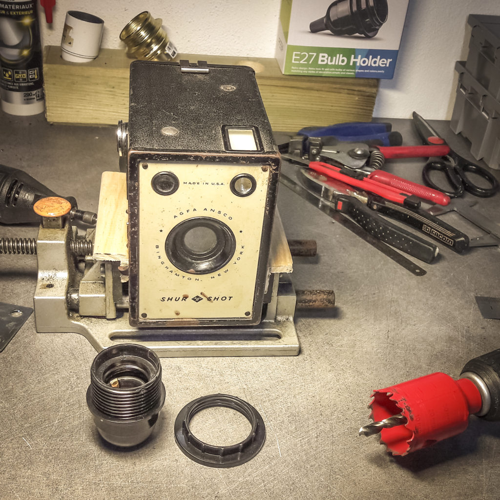 C’est le printemps, Ansco#01 fait sa mue ! Suivez les étapes de sa transformation en lampadaire : 1. Perçages pour l’insertion de la douille et de l’interrupteur à levier. 2. Renforcement du fond avec une contre plaque en acier pour fixation sur trépied photo. 3. Câblage électrique et belle ampoule LED fumée. 4. Installation sur […]