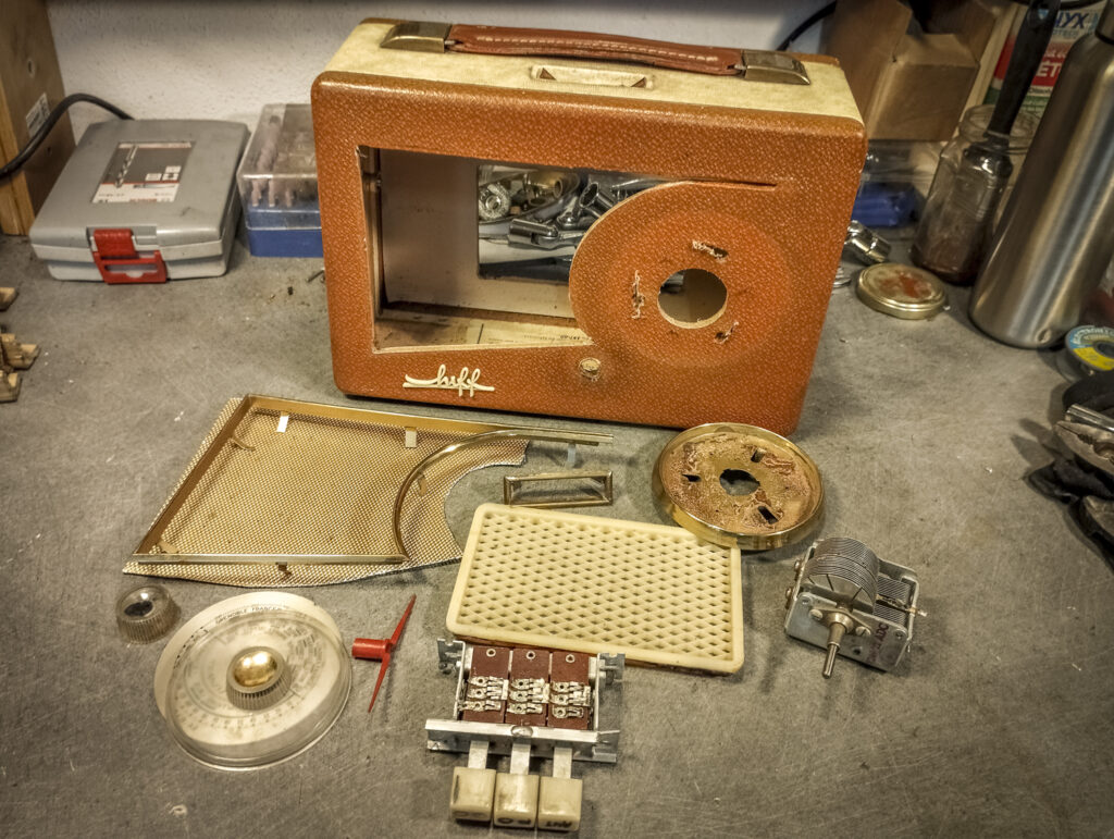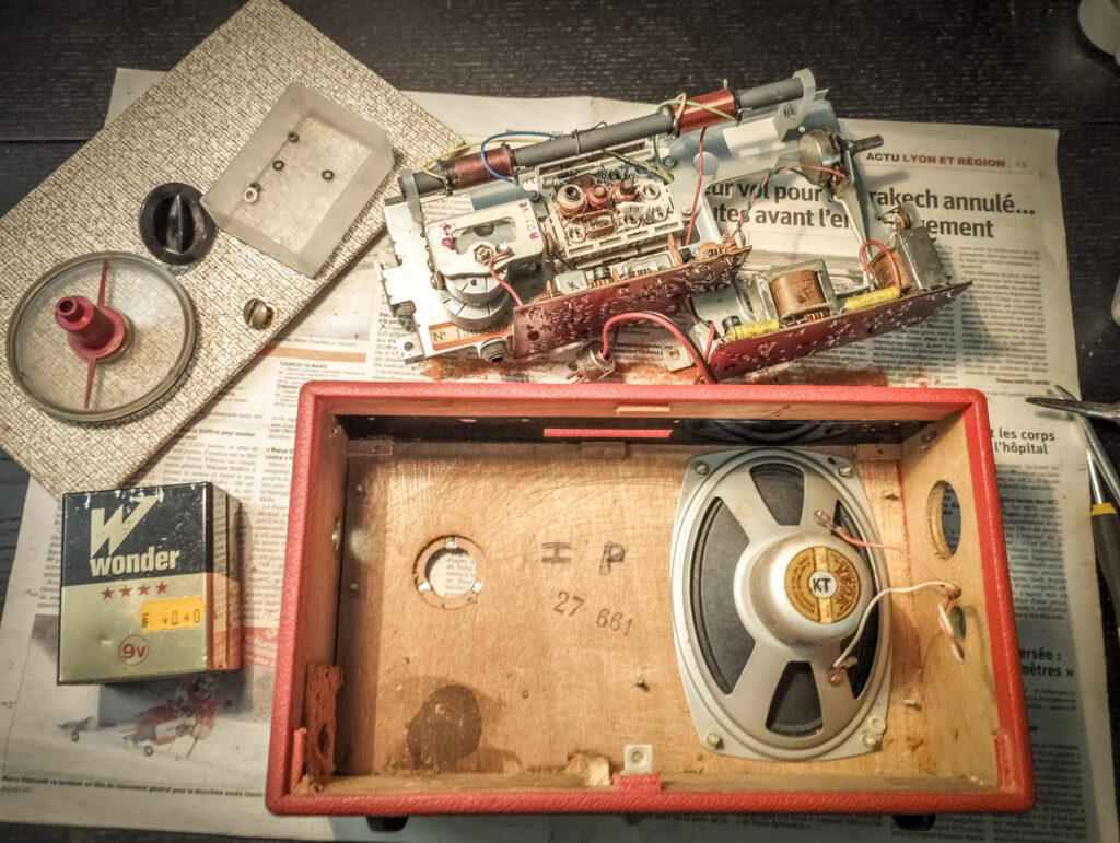 Je commence à en avoir vu passer dans mon atelier, de ces petites valises vintage ! Celle-ci est dans un état vraiment exceptionnel. En termes cosmétiques, je me contente donc, après démontage, de bien nettoyer le revêtement, astiquer les ors et remettre en état le bouton de volume de la façade. Pour finir, un peu […]
