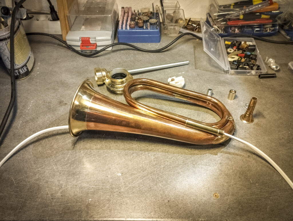 Mais qu’est-ce qui m’a pris d’avoir l’idée saugrenue de transformer un clairon en lampe ? A priori, je pensais que ça passerait crème. Mais ça c’était avant… Ok, fixer une douille dans l’embouchure, pas vraiment de problème grâce à une tige filetée, un petit manchon découpé dans un bout de tuyau d’arrosage, un peu de […]