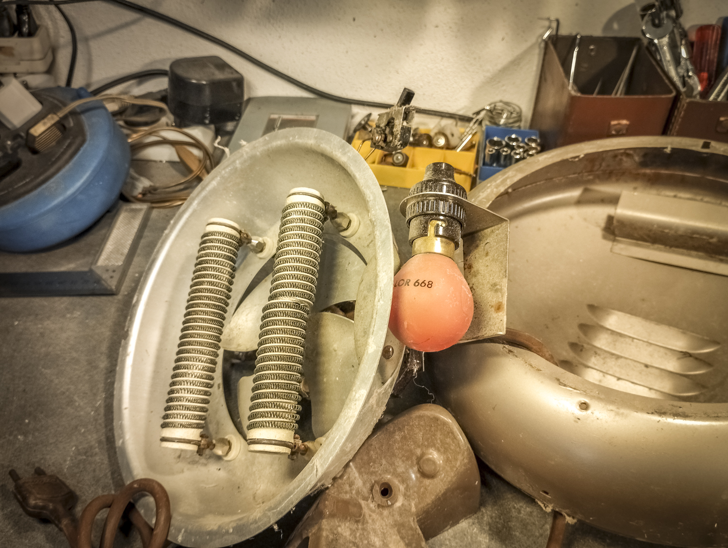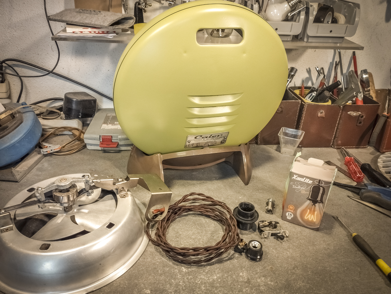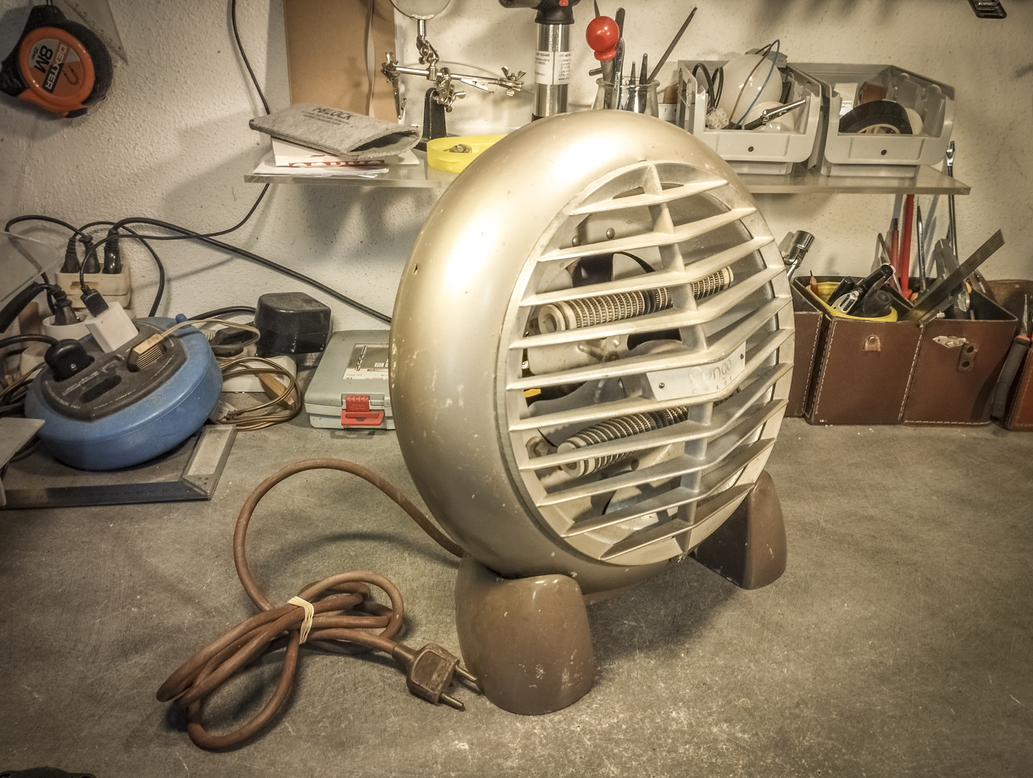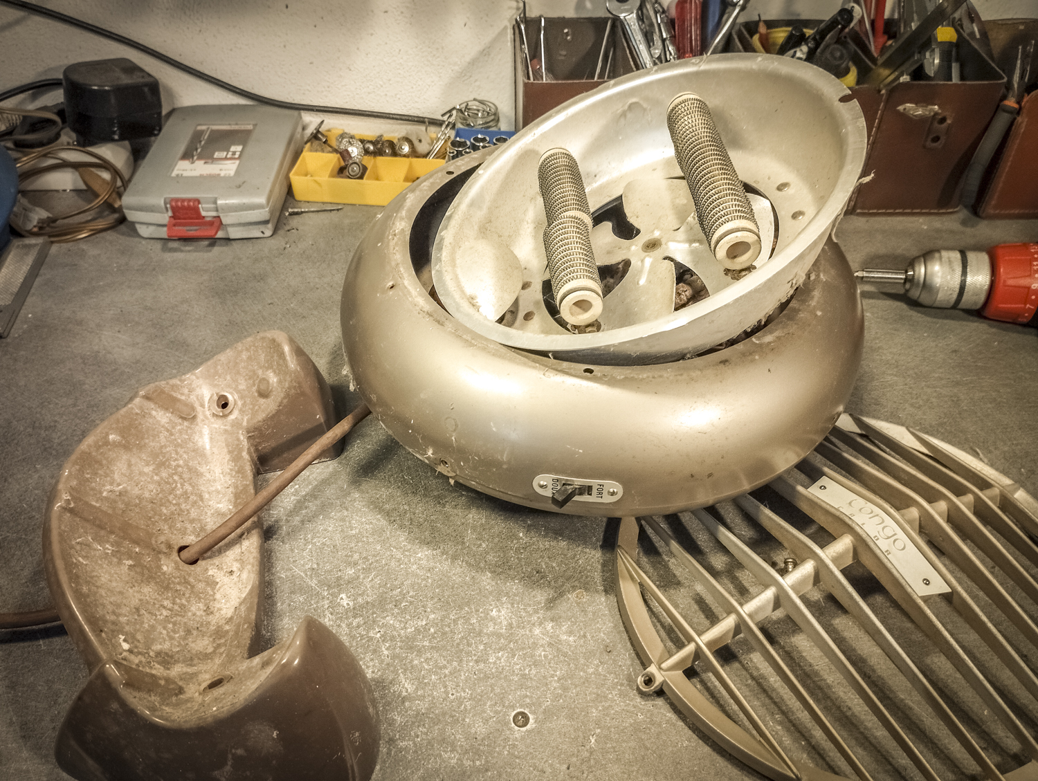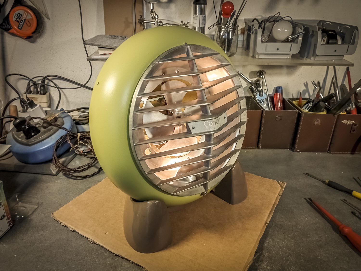 Contrairement au Congo laid. Bon, sinon, voici comment je suis parti d’un radiateur pour arriver à un radiateur. Mais vert. Pour une fois, il est beaucoup question de mise en peinture. Après un démontage de l’appareil, assorti d’une éviscération impitoyable, âmes sensibles s’abstenir, je me retrouve avec un radiateur éparpillé façon puzzle. Je me sépare des 2 grandes résistances spiralées et du stator du ventilateur (partie fixe du moteur constituée d’une bobine de fil de cuivre). Je garde l’axe et les pales pour pouvoir les remettre en place ensuite. Au passage, je remarque la présence d’une petite ampoule cachée ! C’est amusant : en plus de chauffer, ce radiateur produisait une lumière rouge. Je pourrai donc certainement garder le même système (avec de nouveaux composants) pour en faire une lampe. Le gros du travail va donc maintenant consister à faire le peintre en carrosserie : un gros ponçage pour éliminer les zones de peinture abimées et la rouille assez présente, jusqu’à retrouver en partie le métal à nu. Puis appliquer 2 couches d’apprêt (avec ponçage fin entre les 2) pour préparer la surface à la peinture. Puis pulvériser 2 couches de cette très belle peinture mate vert tendre. Un léger ponçage ultrafin pour éliminer quelques irrégularités créées par l’aérosol parfois un peu capricieux. Et enfin, 2 couches de vernis mat pour fixer tout ça et bien protéger la surface. Pour l’occasion, j’ai installé un système de crochets et de filins pour suspendre la coque en « apesanteur » et pouvoir atteindre toutes les zones sans rien toucher. La dernière étape consiste à installer un nouveau combo douille-ampoule à l’arrière du réflecteur, transformer le sélecteur de température (fort/doux) en interrupteur et enfin câbler puis refermer le tout. Congo est comme neuf, prêt pour sa séance beauté à la boutique.