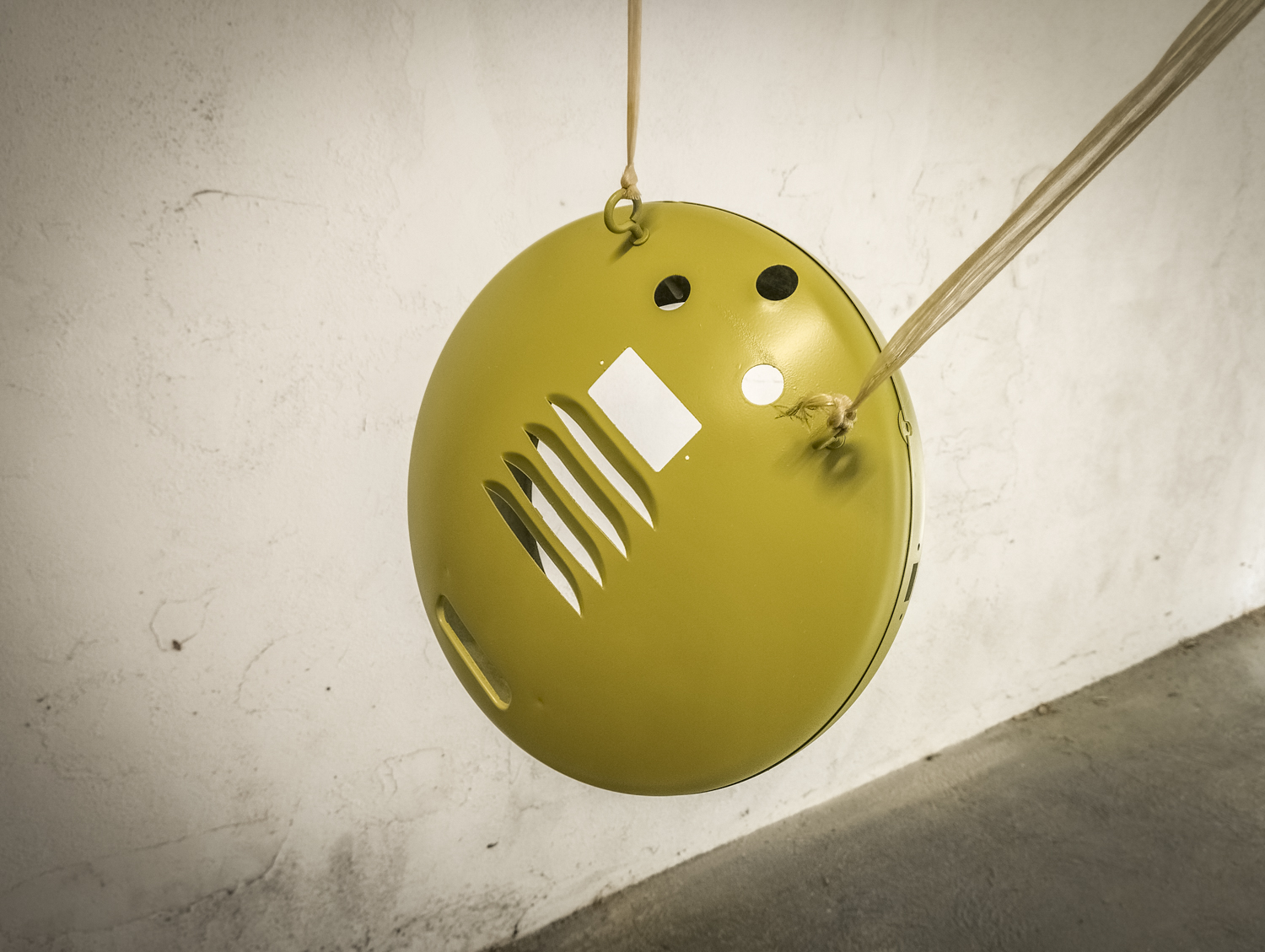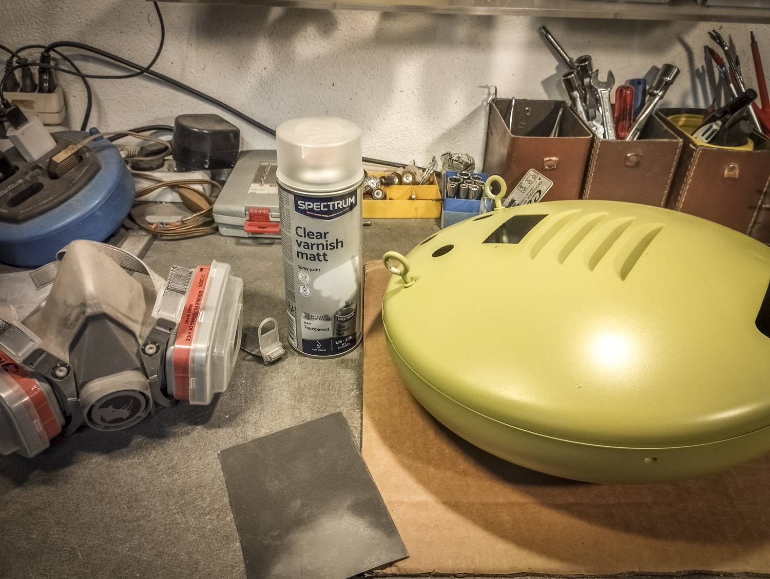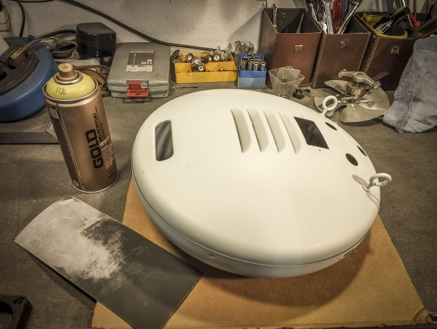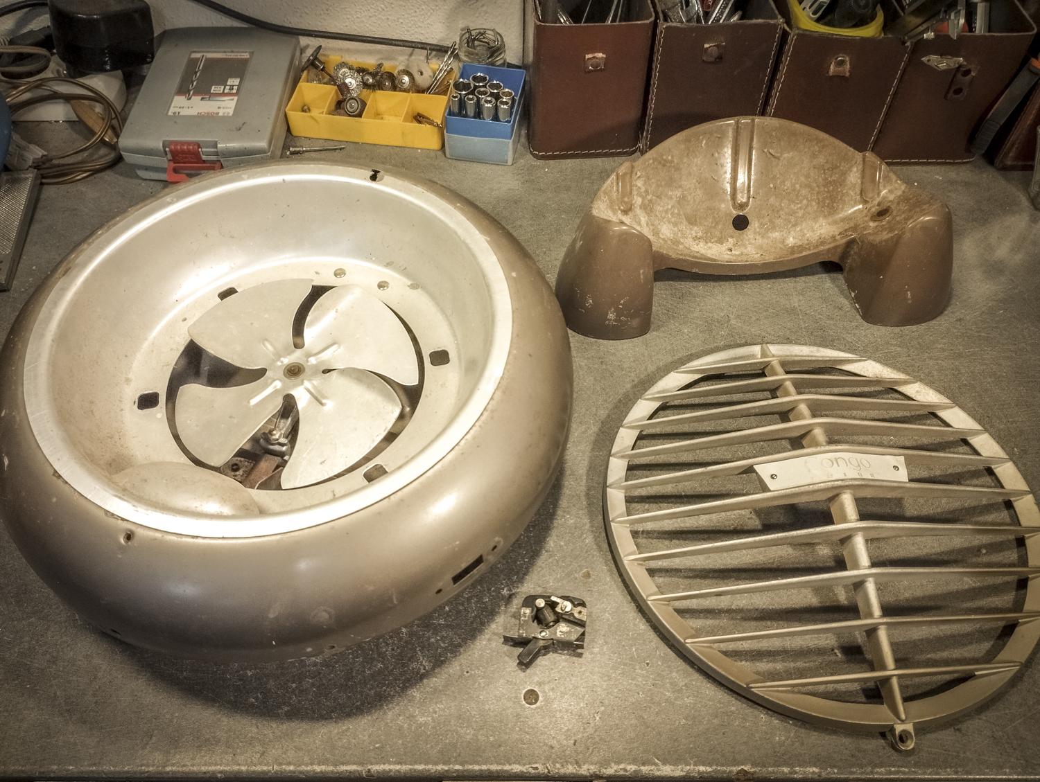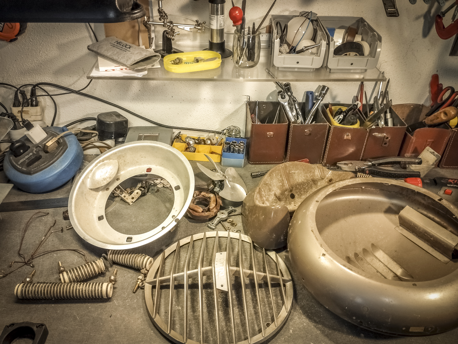 Contrairement au Congo laid. Bon, sinon, voici comment je suis parti d’un radiateur pour arriver à un radiateur. Mais vert. Pour une fois, il est beaucoup question de mise en peinture. Après un démontage de l’appareil, assorti d’une éviscération impitoyable, âmes sensibles s’abstenir, je me retrouve avec un radiateur éparpillé façon puzzle. Je me sépare des 2 grandes résistances spiralées et du stator du ventilateur (partie fixe du moteur constituée d’une bobine de fil de cuivre). Je garde l’axe et les pales pour pouvoir les remettre en place ensuite. Au passage, je remarque la présence d’une petite ampoule cachée ! C’est amusant : en plus de chauffer, ce radiateur produisait une lumière rouge. Je pourrai donc certainement garder le même système (avec de nouveaux composants) pour en faire une lampe. Le gros du travail va donc maintenant consister à faire le peintre en carrosserie : un gros ponçage pour éliminer les zones de peinture abimées et la rouille assez présente, jusqu’à retrouver en partie le métal à nu. Puis appliquer 2 couches d’apprêt (avec ponçage fin entre les 2) pour préparer la surface à la peinture. Puis pulvériser 2 couches de cette très belle peinture mate vert tendre. Un léger ponçage ultrafin pour éliminer quelques irrégularités créées par l’aérosol parfois un peu capricieux. Et enfin, 2 couches de vernis mat pour fixer tout ça et bien protéger la surface. Pour l’occasion, j’ai installé un système de crochets et de filins pour suspendre la coque en « apesanteur » et pouvoir atteindre toutes les zones sans rien toucher. La dernière étape consiste à installer un nouveau combo douille-ampoule à l’arrière du réflecteur, transformer le sélecteur de température (fort/doux) en interrupteur et enfin câbler puis refermer le tout. Congo est comme neuf, prêt pour sa séance beauté à la boutique.