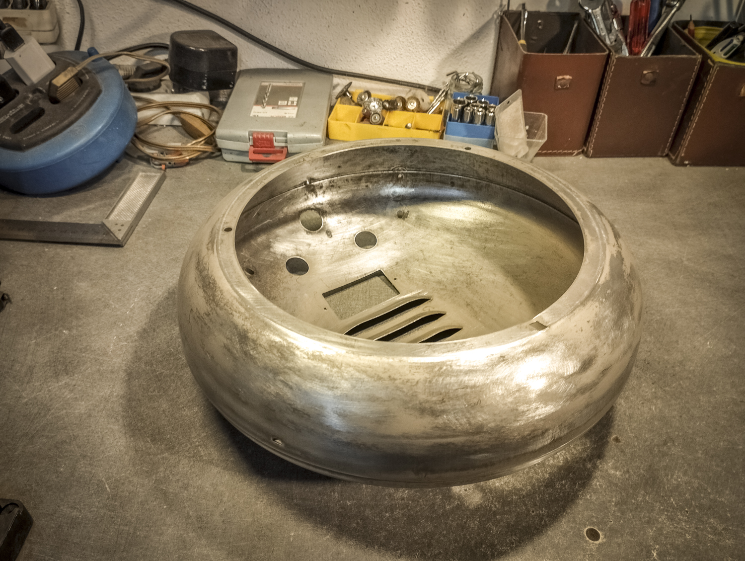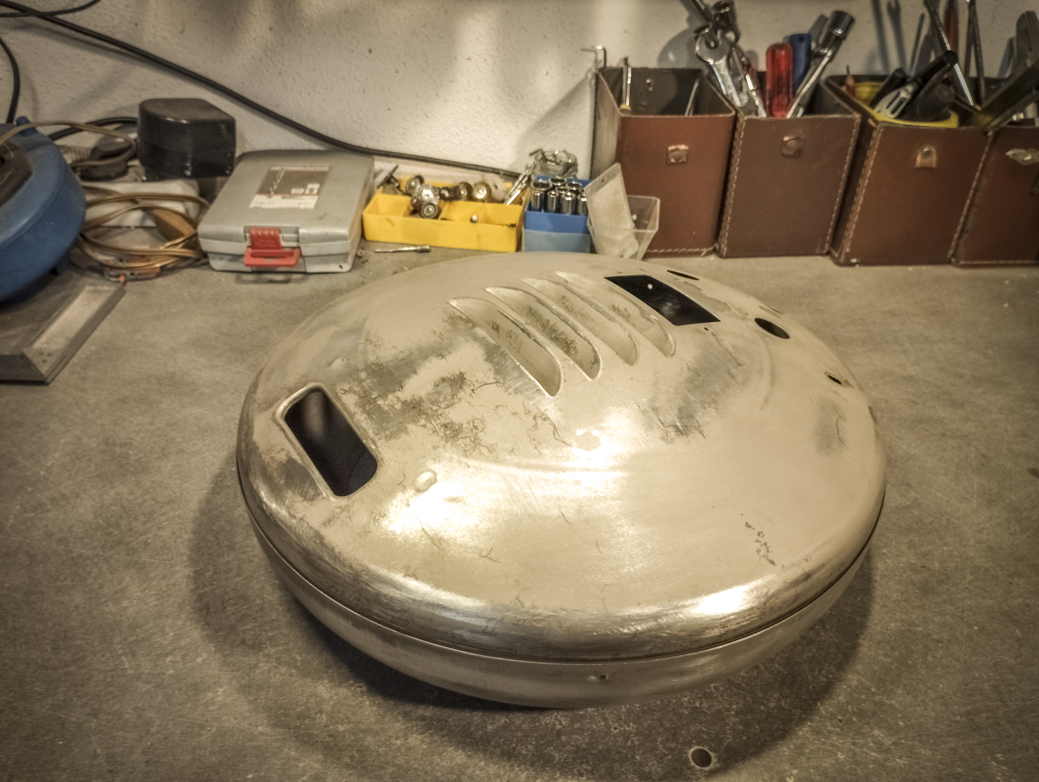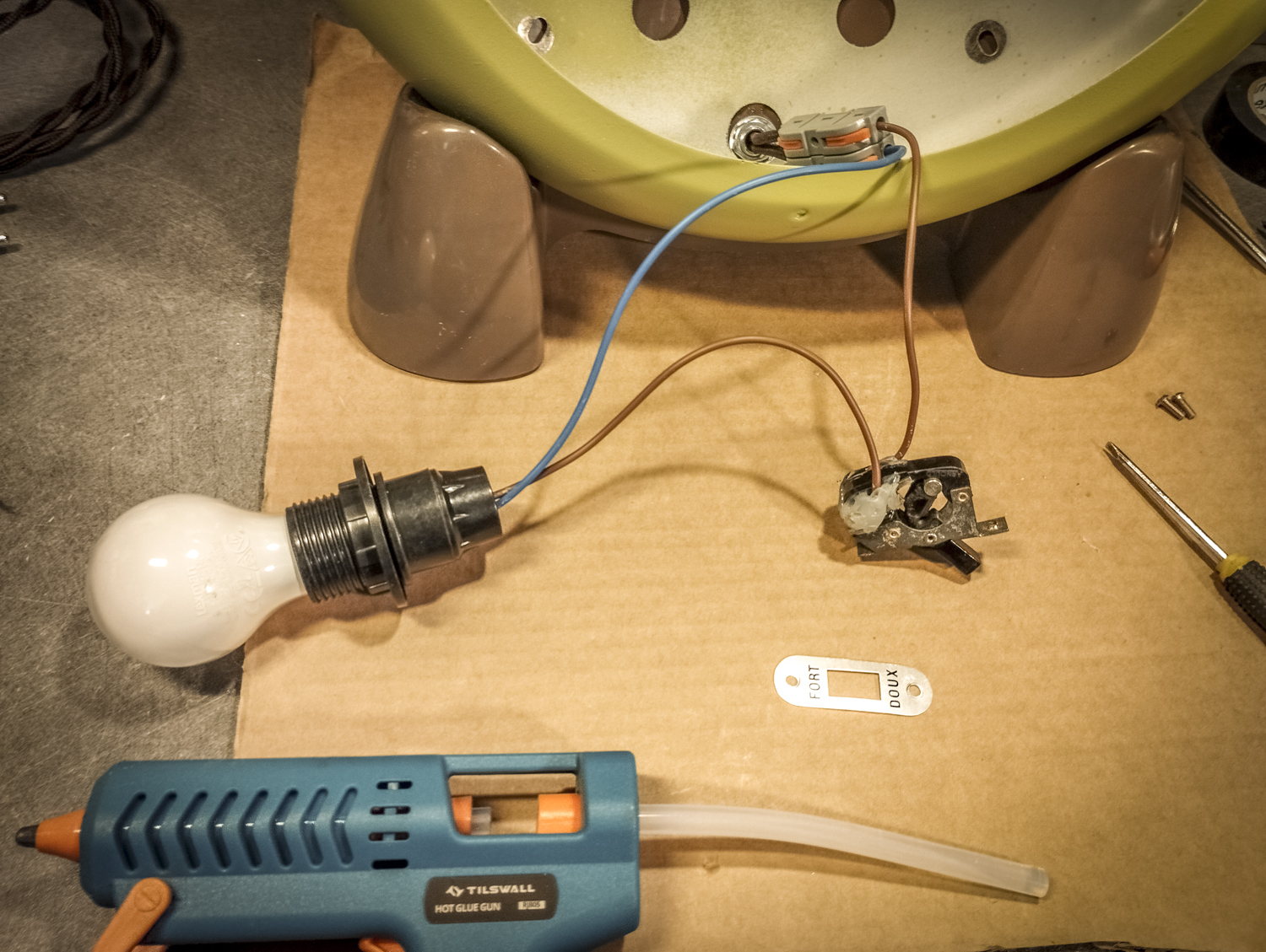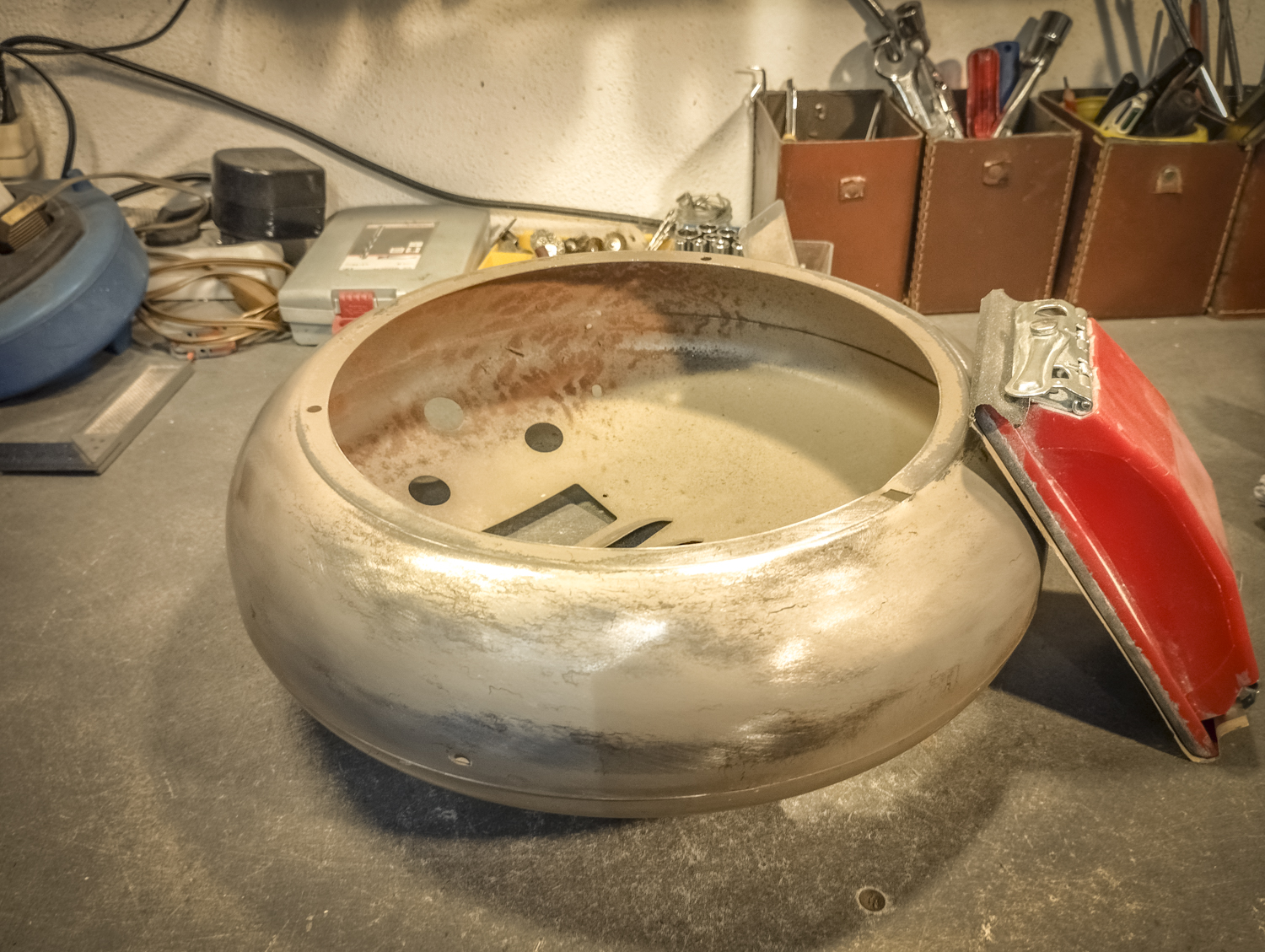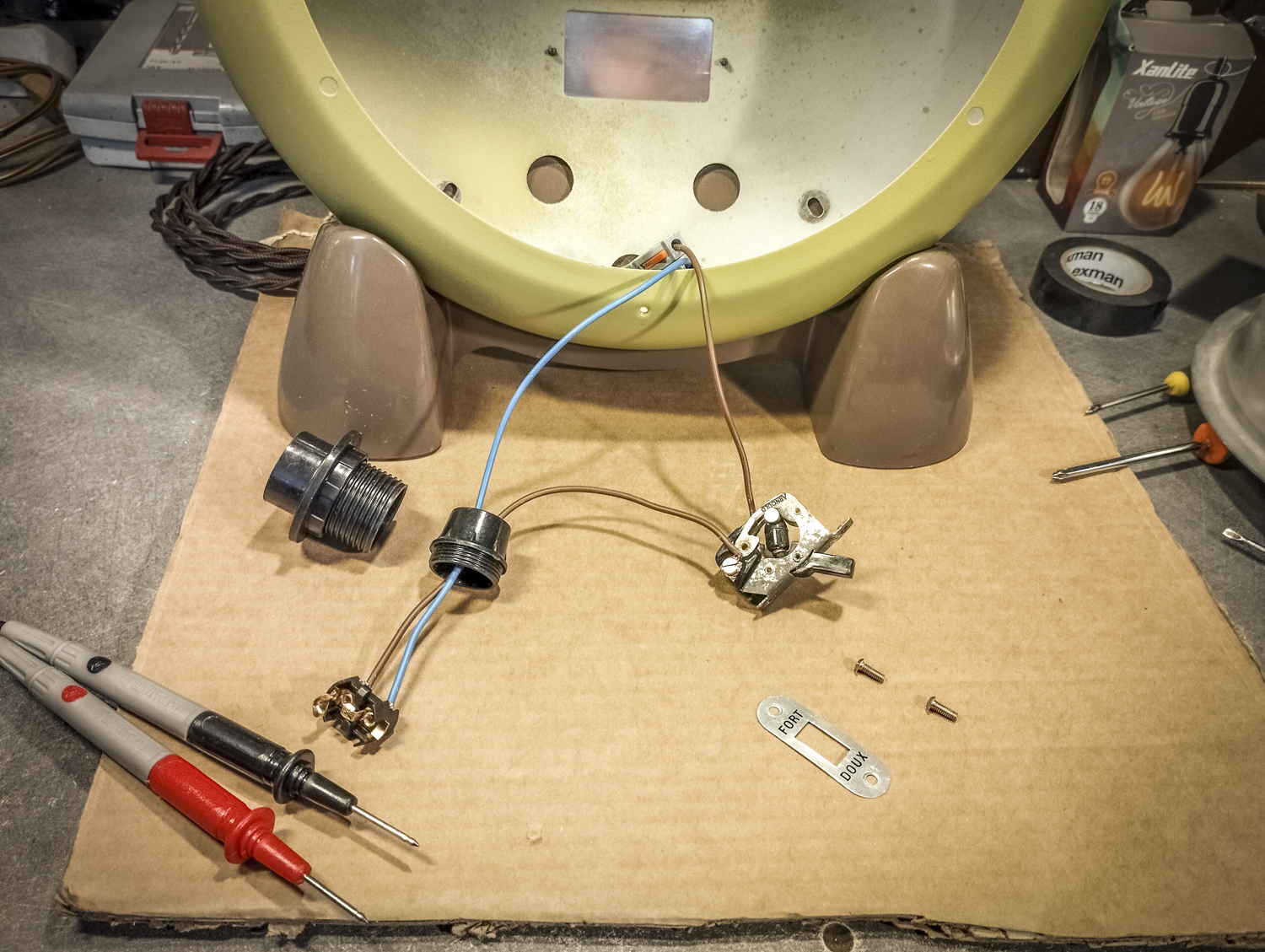 Contrairement au Congo laid. Bon, sinon, voici comment je suis parti d’un radiateur pour arriver à un radiateur. Mais vert. Pour une fois, il est beaucoup question de mise en peinture. Après un démontage de l’appareil, assorti d’une éviscération impitoyable, âmes sensibles s’abstenir, je me retrouve avec un radiateur éparpillé façon puzzle. Je me sépare des 2 grandes résistances spiralées et du stator du ventilateur (partie fixe du moteur constituée d’une bobine de fil de cuivre). Je garde l’axe et les pales pour pouvoir les remettre en place ensuite. Au passage, je remarque la présence d’une petite ampoule cachée ! C’est amusant : en plus de chauffer, ce radiateur produisait une lumière rouge. Je pourrai donc certainement garder le même système (avec de nouveaux composants) pour en faire une lampe. Le gros du travail va donc maintenant consister à faire le peintre en carrosserie : un gros ponçage pour éliminer les zones de peinture abimées et la rouille assez présente, jusqu’à retrouver en partie le métal à nu. Puis appliquer 2 couches d’apprêt (avec ponçage fin entre les 2) pour préparer la surface à la peinture. Puis pulvériser 2 couches de cette très belle peinture mate vert tendre. Un léger ponçage ultrafin pour éliminer quelques irrégularités créées par l’aérosol parfois un peu capricieux. Et enfin, 2 couches de vernis mat pour fixer tout ça et bien protéger la surface. Pour l’occasion, j’ai installé un système de crochets et de filins pour suspendre la coque en « apesanteur » et pouvoir atteindre toutes les zones sans rien toucher. La dernière étape consiste à installer un nouveau combo douille-ampoule à l’arrière du réflecteur, transformer le sélecteur de température (fort/doux) en interrupteur et enfin câbler puis refermer le tout. Congo est comme neuf, prêt pour sa séance beauté à la boutique.