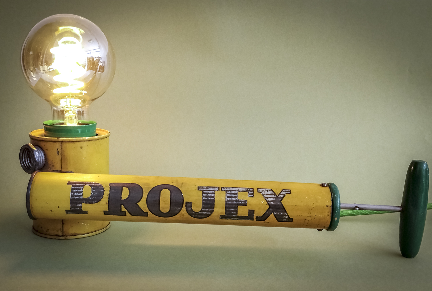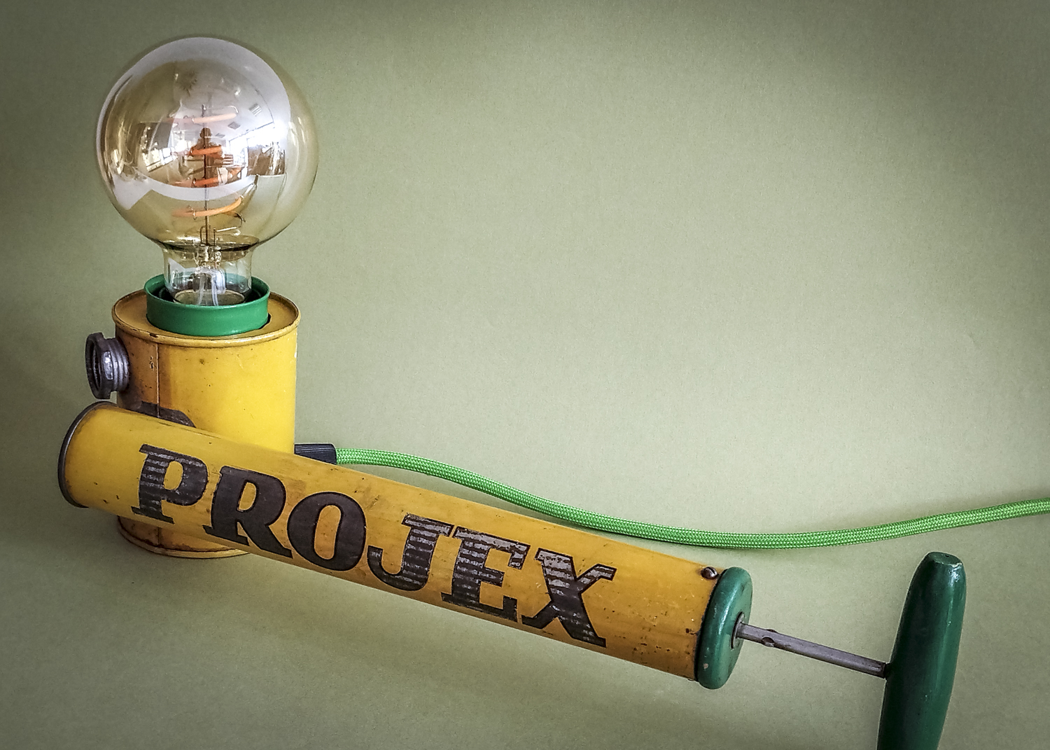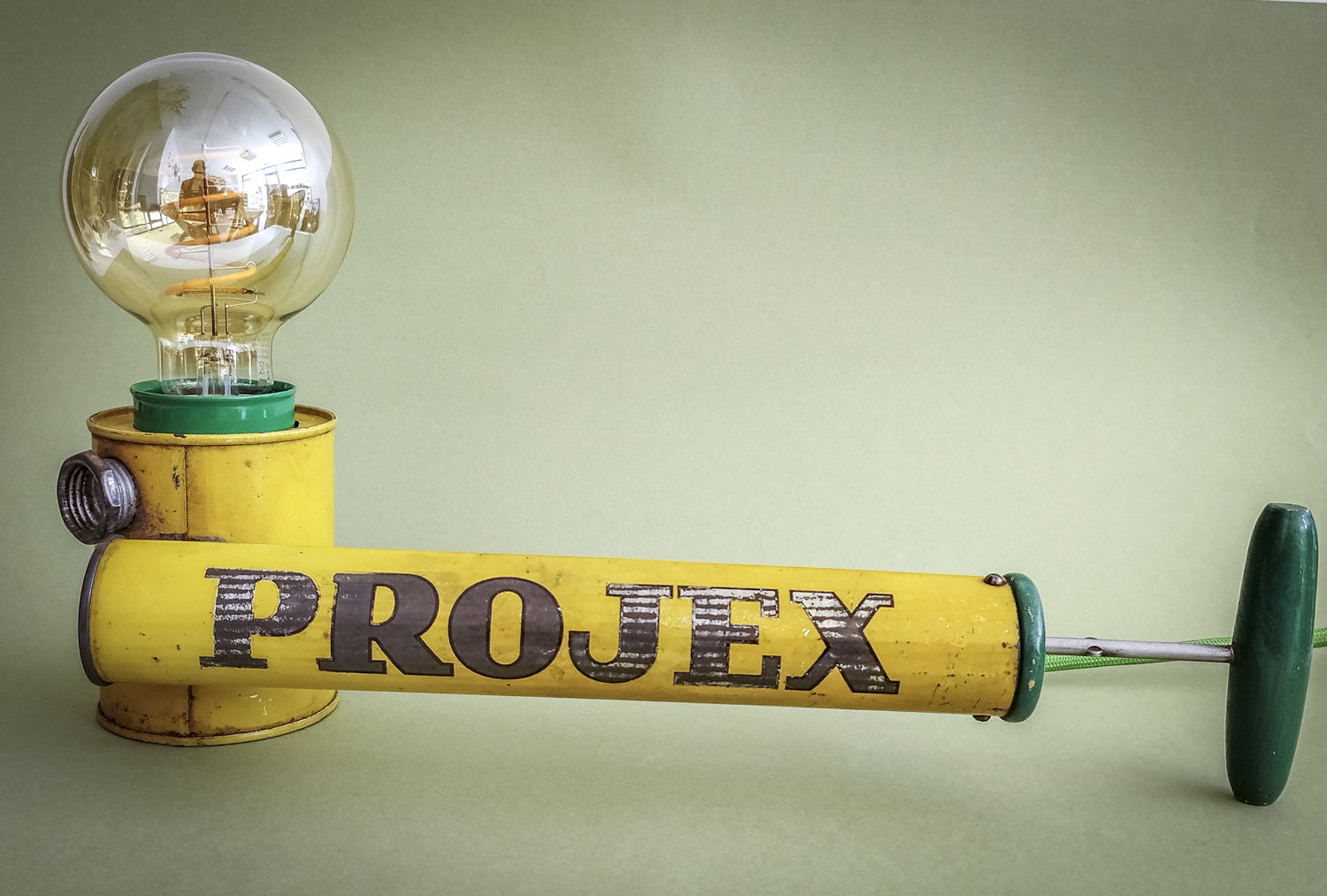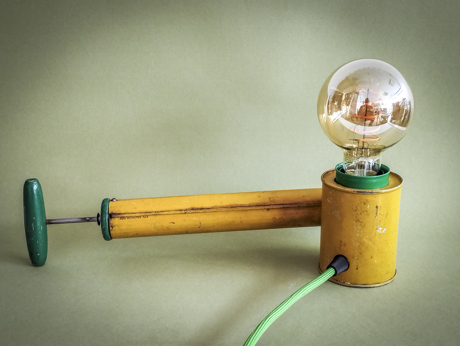 Durant mes longues recherches de trouvailles surprenantes, je l’avoue en grande partie sur internet qui foisonne d’objets anciens divers et variés, je me suis mis en tête de dénicher un pulvérisateur ! Un quoi ?? Ce piston en fer blanc, qui peut être inconnu pour la plupart, servait donc à pulvériser des substances (chimiques) pour éradiquer des insectes ou épandre de l’engrais, par exemple. Certains connaisseurs penseront sûrement au célèbre insecticide « Fly Tox » et ses gros caractères majuscules blancs sur fond bleu. Ou d’autres, à la « sulfateuse » du Capitaine Haddock dans les aventures de Tintin (l’Affaire Tournesol). Celui que j’ai finalement trouvé, particulièrement notable du point de vue de ses couleurs atypiques et très graphiques, date de 1953 (décidément, j’ai un détecteur d’années 50 intégré !). Son nom, un peu moins belliqueux que d’autres, peut signifier projection ou projet. Intéressant. Il était aussi dans un bel état de conservation (ses congénères sont souvent très abîmés car la tôle et la peinture sont fragiles) avec une belle patine naturelle qui accentuait son aspect vintage. Ni une ni deux et c’était parti pour en faire une lampe originale ! Plutôt que comme d’autres avant moi qui optèrent pour l’ampoule disposée basiquement au bout du tube, j’ai choisi l’option, certes plus compliquée, de l’insérer dans le réservoir. Et de placer le pulvérisateur sur sa tranche pour mettre en avant l’imposant nom en caractères argentés. Le tout équilibré par la poignée en bois du piston à l’autre bout. Ensuite, il a suffi de l’habiller d’accessoires harmonisés avec ses couleurs. J’ai donc choisi de jouer sur un camaïeu de verts : un beau cache douille en métal et un câble rond tissé. Et quelques points de noir pour le serre-câble, l’interrupteur torpille et la fiche (et ses connecteurs verts, ça tombait bien). Attrapez-le vite avant qu’il ne parte. Rassurez-vous, vous ne risquez plus rien, il ne projette désormais plus qu’une chaude lumière tout à fait inoffensive ! Voilà une belle reconversion pacifiste ! Peace !