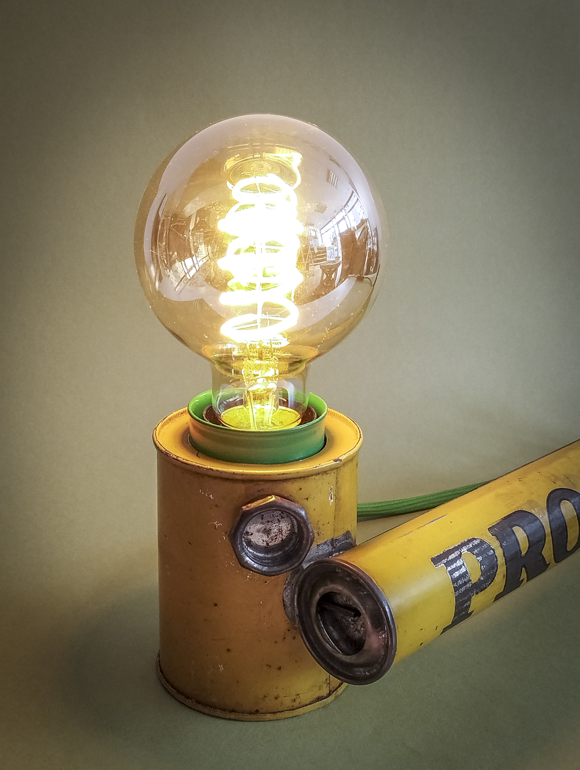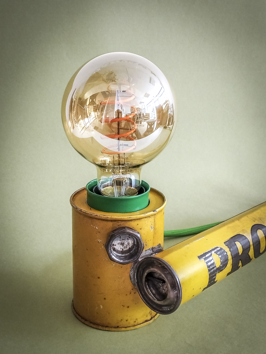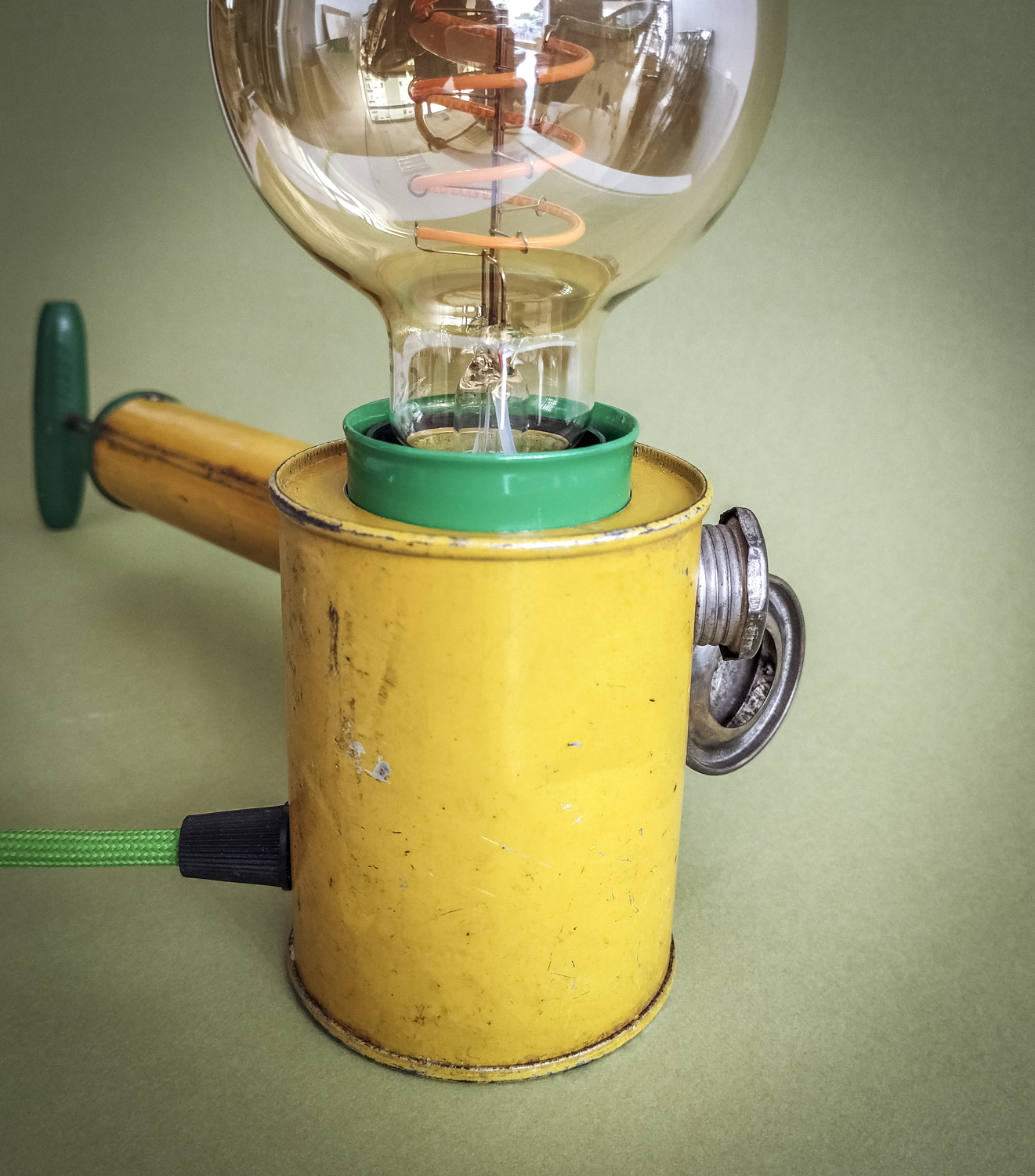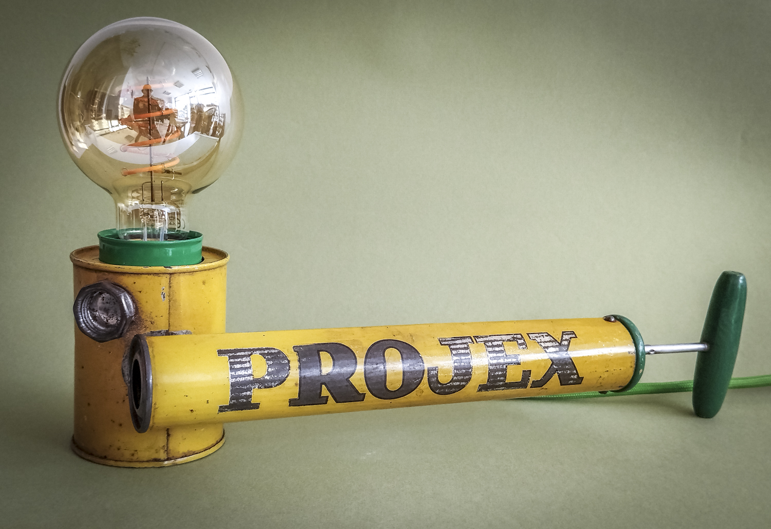 Durant mes longues recherches de trouvailles surprenantes, je l’avoue en grande partie sur internet qui foisonne d’objets anciens divers et variés, je me suis mis en tête de dénicher un pulvérisateur ! Un quoi ?? Ce piston en fer blanc, qui peut être inconnu pour la plupart, servait donc à pulvériser des substances (chimiques) pour éradiquer des insectes ou épandre de l’engrais, par exemple. Certains connaisseurs penseront sûrement au célèbre insecticide « Fly Tox » et ses gros caractères majuscules blancs sur fond bleu. Ou d’autres, à la « sulfateuse » du Capitaine Haddock dans les aventures de Tintin (l’Affaire Tournesol). Celui que j’ai finalement trouvé, particulièrement notable du point de vue de ses couleurs atypiques et très graphiques, date de 1953 (décidément, j’ai un détecteur d’années 50 intégré !). Son nom, un peu moins belliqueux que d’autres, peut signifier projection ou projet. Intéressant. Il était aussi dans un bel état de conservation (ses congénères sont souvent très abîmés car la tôle et la peinture sont fragiles) avec une belle patine naturelle qui accentuait son aspect vintage. Ni une ni deux et c’était parti pour en faire une lampe originale ! Plutôt que comme d’autres avant moi qui optèrent pour l’ampoule disposée basiquement au bout du tube, j’ai choisi l’option, certes plus compliquée, de l’insérer dans le réservoir. Et de placer le pulvérisateur sur sa tranche pour mettre en avant l’imposant nom en caractères argentés. Le tout équilibré par la poignée en bois du piston à l’autre bout. Ensuite, il a suffi de l’habiller d’accessoires harmonisés avec ses couleurs. J’ai donc choisi de jouer sur un camaïeu de verts : un beau cache douille en métal et un câble rond tissé. Et quelques points de noir pour le serre-câble, l’interrupteur torpille et la fiche (et ses connecteurs verts, ça tombait bien). Attrapez-le vite avant qu’il ne parte. Rassurez-vous, vous ne risquez plus rien, il ne projette désormais plus qu’une chaude lumière tout à fait inoffensive ! Voilà une belle reconversion pacifiste ! Peace !