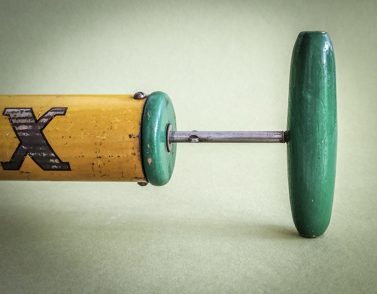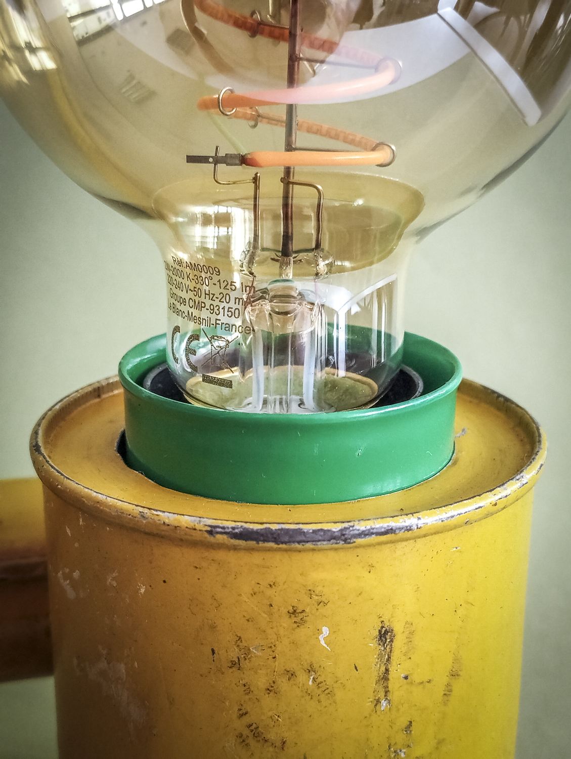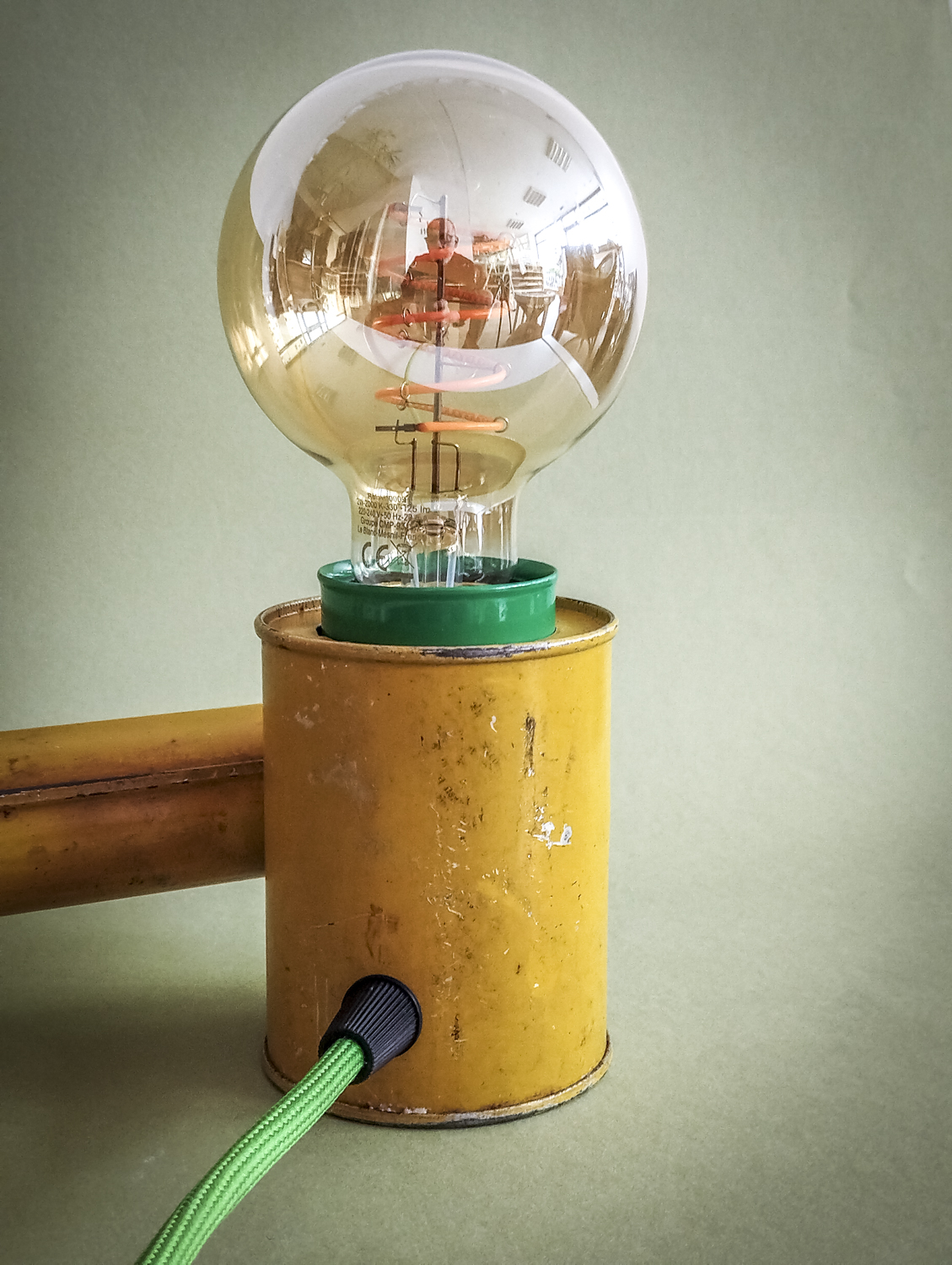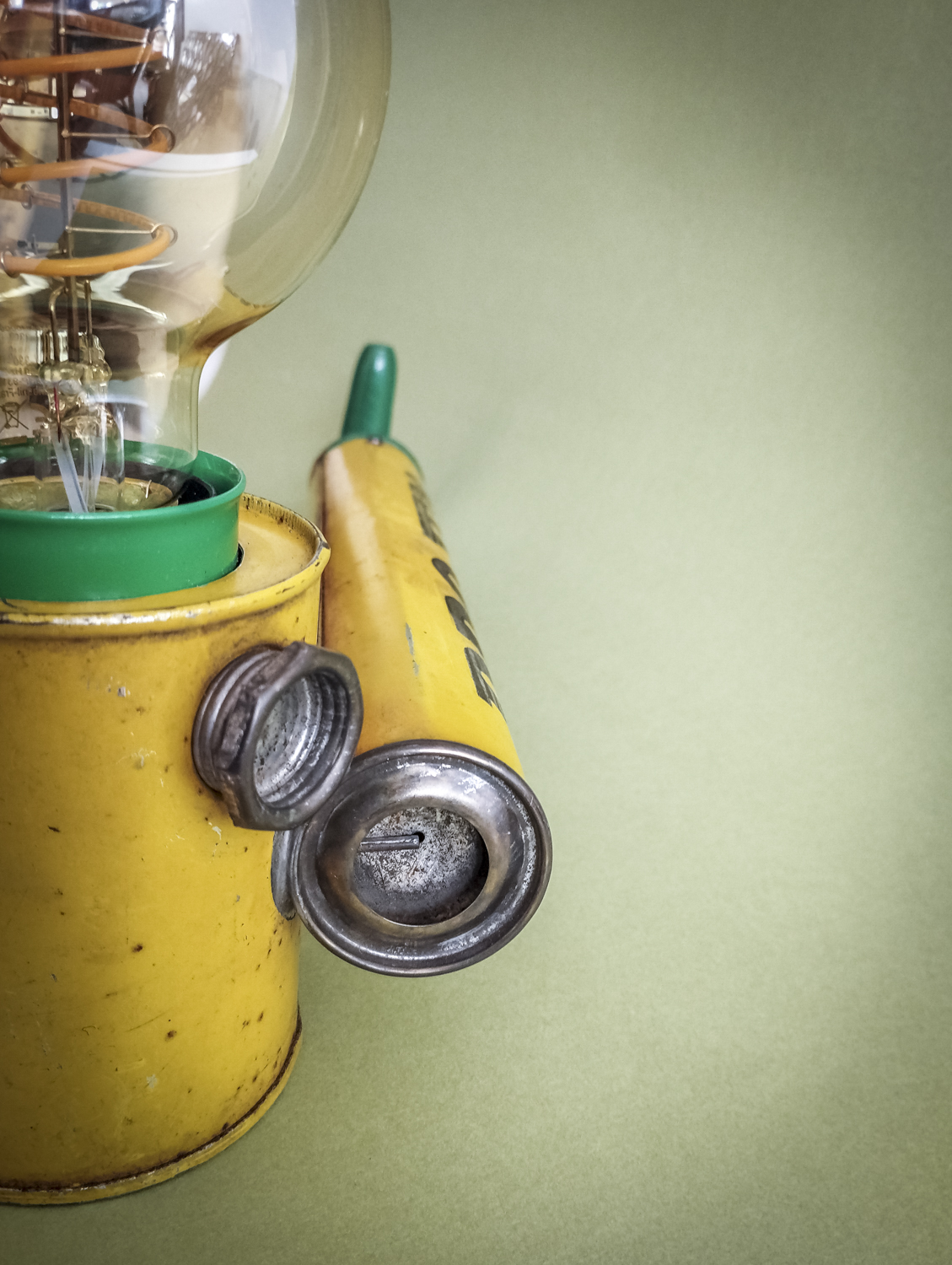 Durant mes longues recherches de trouvailles surprenantes, je l’avoue en grande partie sur internet qui foisonne d’objets anciens divers et variés, je me suis mis en tête de dénicher un pulvérisateur ! Un quoi ?? Ce piston en fer blanc, qui peut être inconnu pour la plupart, servait donc à pulvériser des substances (chimiques) pour éradiquer des insectes ou épandre de l’engrais, par exemple. Certains connaisseurs penseront sûrement au célèbre insecticide « Fly Tox » et ses gros caractères majuscules blancs sur fond bleu. Ou d’autres, à la « sulfateuse » du Capitaine Haddock dans les aventures de Tintin (l’Affaire Tournesol). Celui que j’ai finalement trouvé, particulièrement notable du point de vue de ses couleurs atypiques et très graphiques, date de 1953 (décidément, j’ai un détecteur d’années 50 intégré !). Son nom, un peu moins belliqueux que d’autres, peut signifier projection ou projet. Intéressant. Il était aussi dans un bel état de conservation (ses congénères sont souvent très abîmés car la tôle et la peinture sont fragiles) avec une belle patine naturelle qui accentuait son aspect vintage. Ni une ni deux et c’était parti pour en faire une lampe originale ! Plutôt que comme d’autres avant moi qui optèrent pour l’ampoule disposée basiquement au bout du tube, j’ai choisi l’option, certes plus compliquée, de l’insérer dans le réservoir. Et de placer le pulvérisateur sur sa tranche pour mettre en avant l’imposant nom en caractères argentés. Le tout équilibré par la poignée en bois du piston à l’autre bout. Ensuite, il a suffi de l’habiller d’accessoires harmonisés avec ses couleurs. J’ai donc choisi de jouer sur un camaïeu de verts : un beau cache douille en métal et un câble rond tissé. Et quelques points de noir pour le serre-câble, l’interrupteur torpille et la fiche (et ses connecteurs verts, ça tombait bien). Attrapez-le vite avant qu’il ne parte. Rassurez-vous, vous ne risquez plus rien, il ne projette désormais plus qu’une chaude lumière tout à fait inoffensive ! Voilà une belle reconversion pacifiste ! Peace !