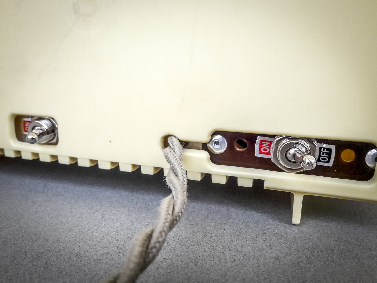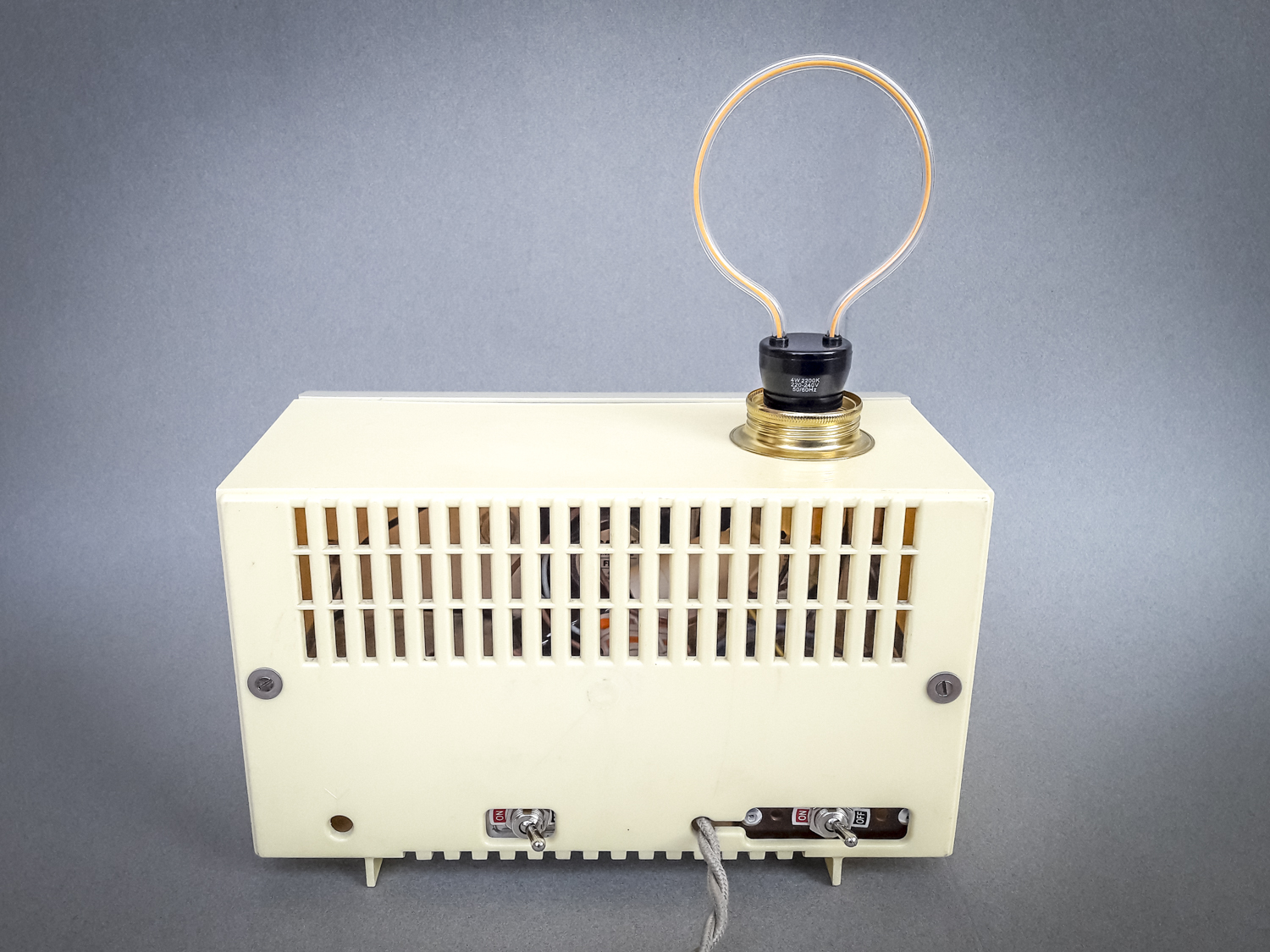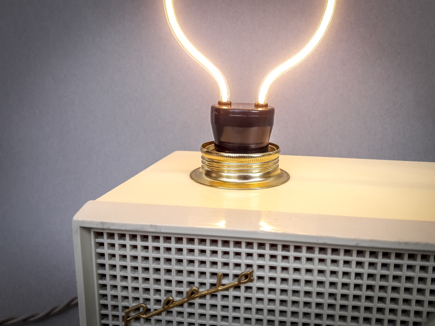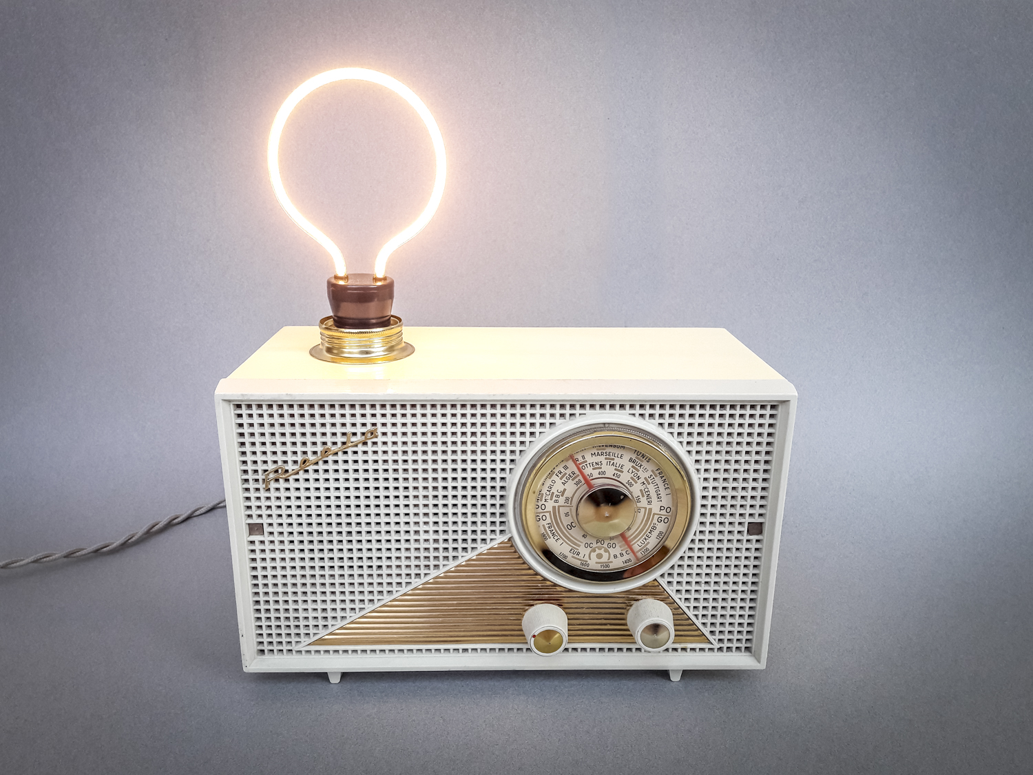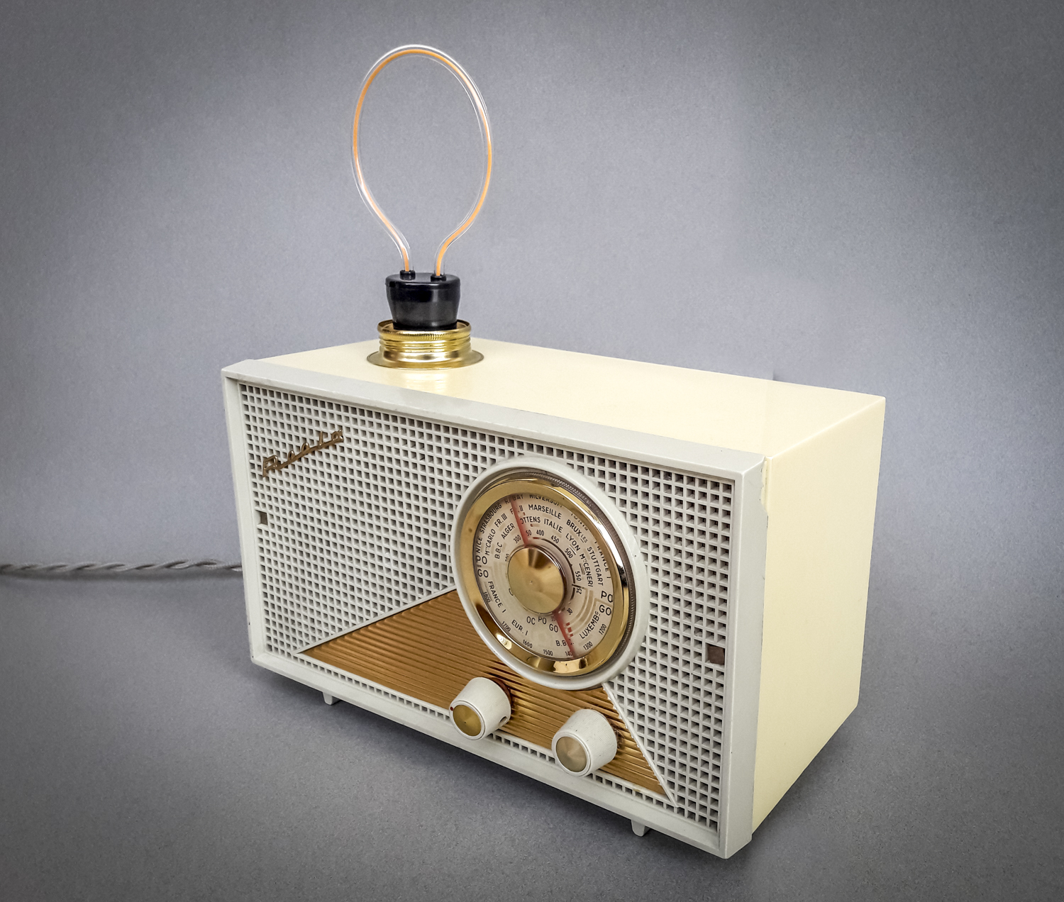 Toujours en recherche de nouveaux vieux objets inspirants, je suis tombé raide dingue de cette magnifique radio TSF dans le plus pur style années 50/60 ! Ses dimensions modestes permettaient aisément d’en faire une lampe à poser. Mais c’eut été dommage de ne pas aller plus loin en tentant de lui redonner la voix qu’elle avait malheureusement perdue dans la course au progrès technologique. J’ai donc entrepris, non sans quelques prises de tête et réflexions intenses, de la doter d’un module amplificateur bluetooth et d’une paire de haut-parleurs tout neufs. J’ai même pu garder la fonctionnalité d’un des deux boutons rotatifs pour régler le volume. Côté éclairage, j’ai dégoté une ampoule LED « silhouette » extraordinaire qui trône au-dessus comme une antenne ! Une jolie douille laiton harmonisée avec les ors de la façade et un beau câble tressé en tissu assorti couleur sable et cette superbe lampe-enceinte était née ! Parce qu’on écoute pas toujours de la musique dans l’obscurité, il est bien-sûr possible d’allumer séparément l’ampoule et le son avec des interrupteurs distincts logés dans des ouvertures rendues libres à l’arrière ! Cette pièce exceptionnelle n’attend maintenant plus que de baigner votre intérieur de son et de lumière…